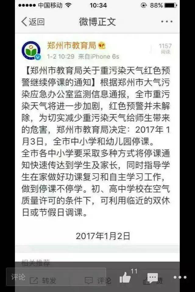 郑州市气象台2017年1月3日06时55分发布大雾红色预警信号:预计今天凌晨到上午,郑州市区将出现能见度小于50米的雾,请注意防范。