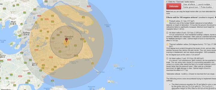 为了帮助世界了解核武器爆炸的后果,惠勒斯坦开发出一款名为“Nukemap”的交互式浏览器应用。他写道:“有些人认为核弹爆炸会立即摧毁世界上的所有东西,其他人则认为它们与传统炸弹没什么区别,而实际上其影响介于两者之间。”为了展示这种影响,Nukemap允许你建造虚拟核弹,并把它投到地球上的任何地方。该软件使用了解密的方程式以及有关核武器及其效果的模型,包括火球大小、爆炸半径、辐射区等,然后将结果呈现在谷歌地图上。