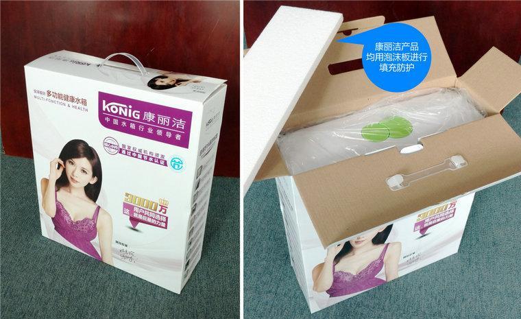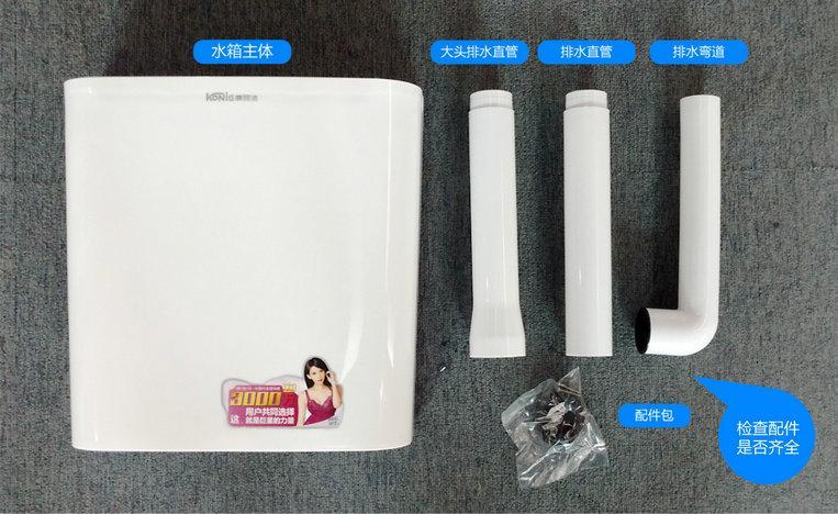 观察外包装是否完整,有无挤压。康丽洁产品采用了泡沫保护,水箱用专用防尘塑料袋包装。
