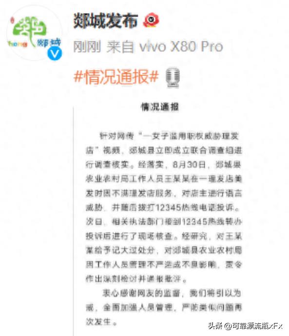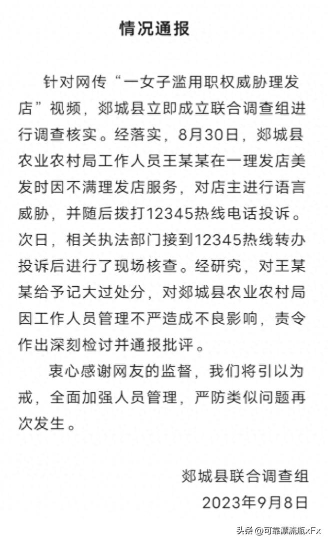 郯城县政府对此事高度重视,迅速成立了联合调查组进行调查核实。经过调查,确认了女子的身份为郯城县农业农村局的工作人员,对其进行记大过处分,并让郯城县农业农村局对因工作人员管理不严造成不良影响,责令其作出深刻检讨并通报批评。。