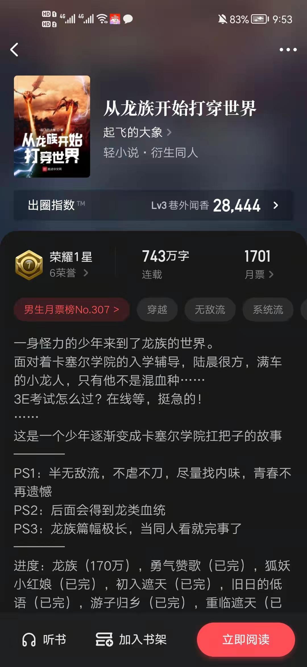 当古老东方世界的密血武者,穿越到龙族的世界上又会碰撞出怎样的火花呢?这是一个拥有比龙族更高血统的男孩,以至强至暴逐步变成卡塞尔学院扛把子的故事,半无敌文,不刀不虐,喜欢的女孩,就要用尽全力去保护她。虽然是每打穿一个世界就开新图(新世界),但是龙族篇幅巨长,当同人文看就OK了,另外后面的狐妖小红娘故事也写得嗷嗷精彩,双厨狂喜!