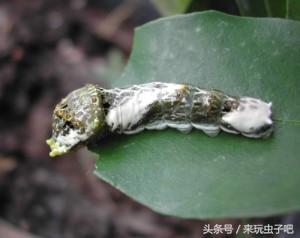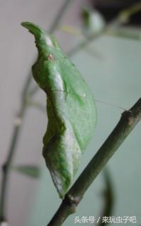 当五龄幼虫准备化蛹时,会爬到适当的地方,静止不动一段时间,慢慢吐出丝将身体固定在枝条上。