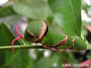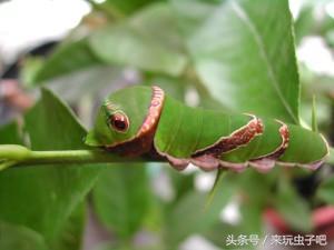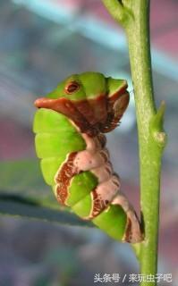 五龄幼虫的身体,除了用绿色这个保护色来隐藏自己之外,当遇到危险时,头部会伸出臭角并发出臭味,藉此吓走敌人。