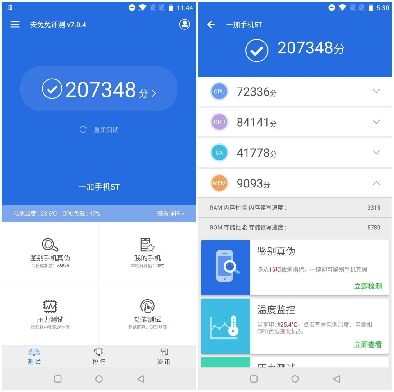 一加5T搭载了骁龙835处理器,拥有6GB/8GB运行内存+64GB/128GB存储组合,运行基于Android7.1.1的氢OS3.7.0系统,让一加5T拥有了不错的性能表现。如此强悍的配置使之在安兔兔跑分软件上最终达到207348分,这个分数可以说是目前跑分最高的安卓机,另外3DMARK上得分为3598,分数也相当的高。