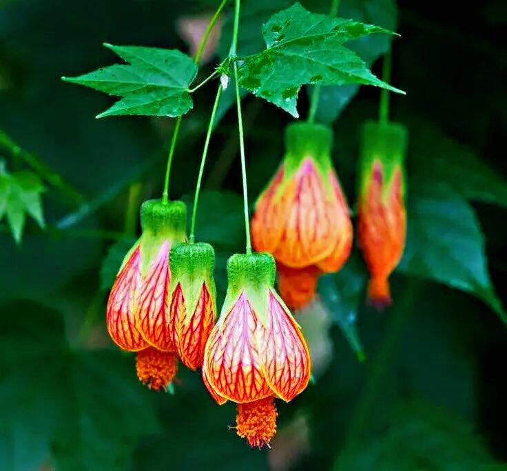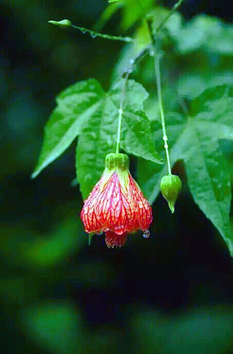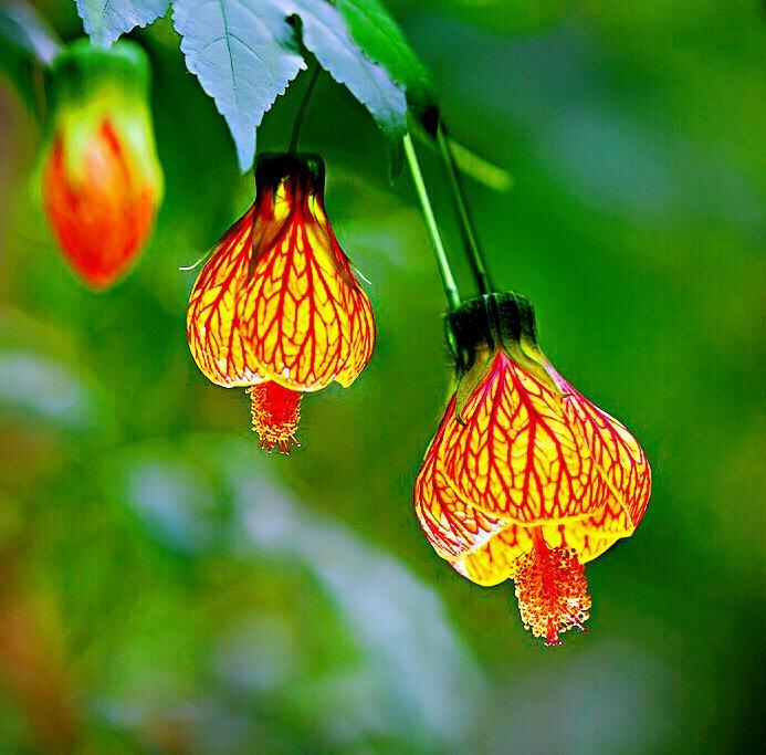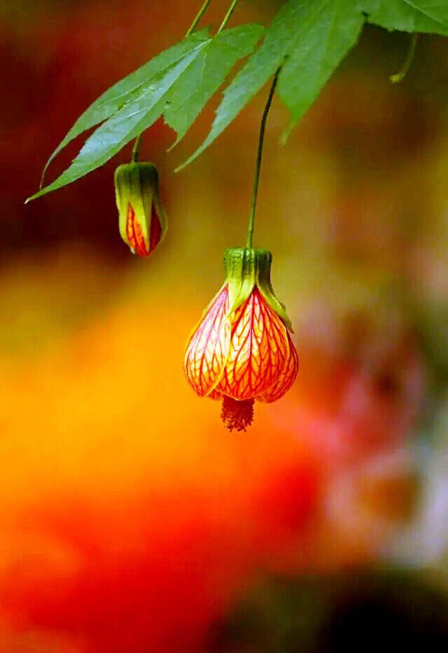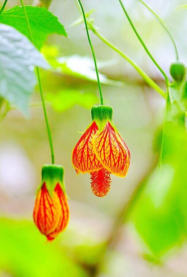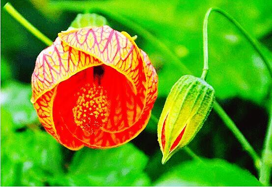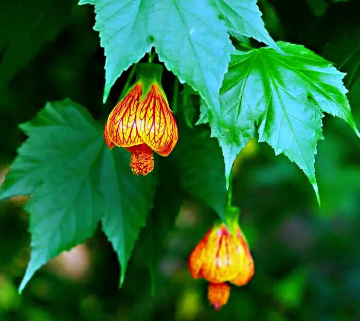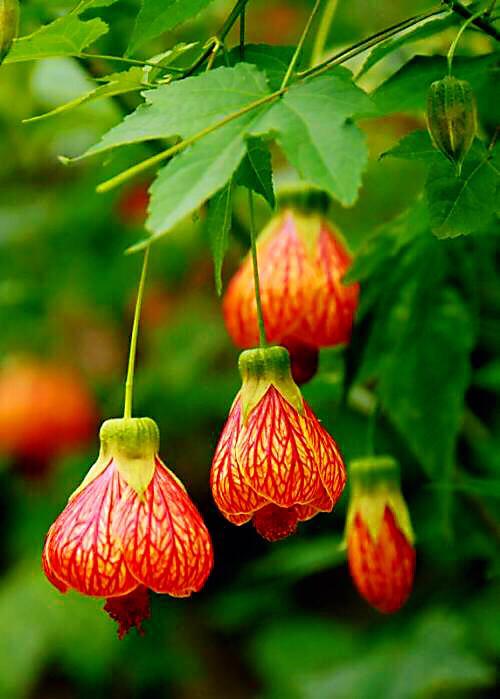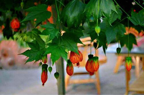 金铃花,锦葵科苘麻属常绿灌木。株高1米。叶翠绿,质厚,边缘锯齿形。花朵钟形,黄色至橙红色,上有紫红色脉纹。花期极长,只要光照充足,温度适宜,可常年开花。