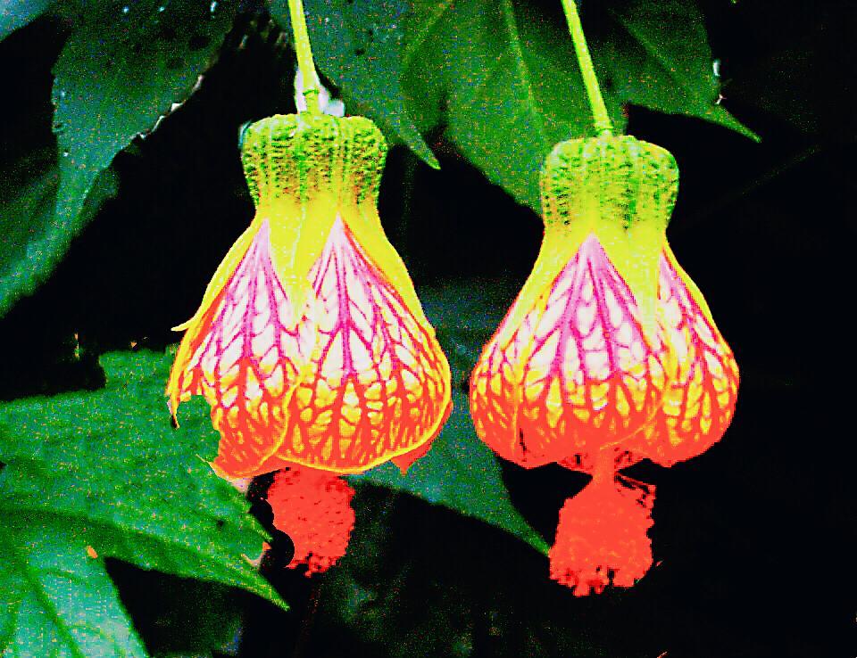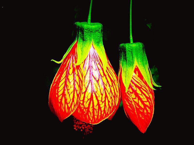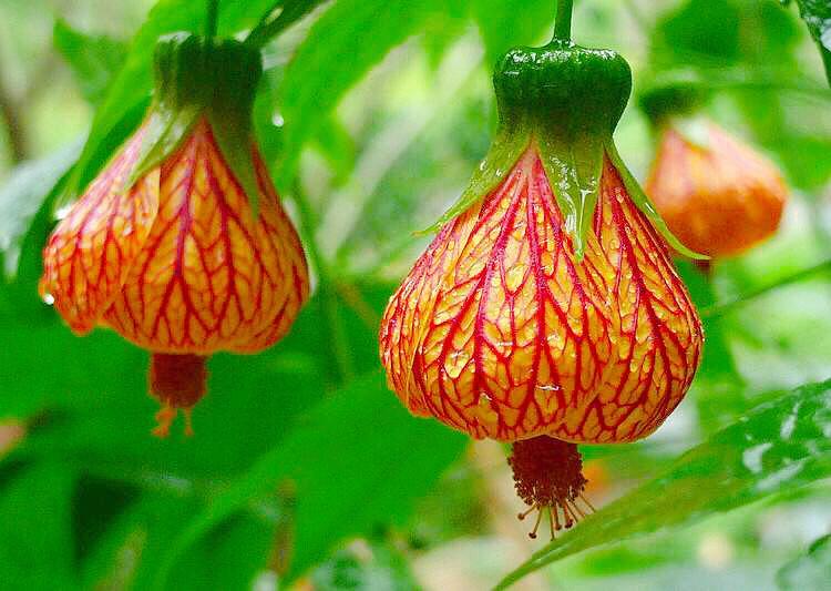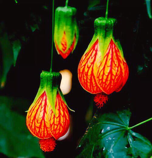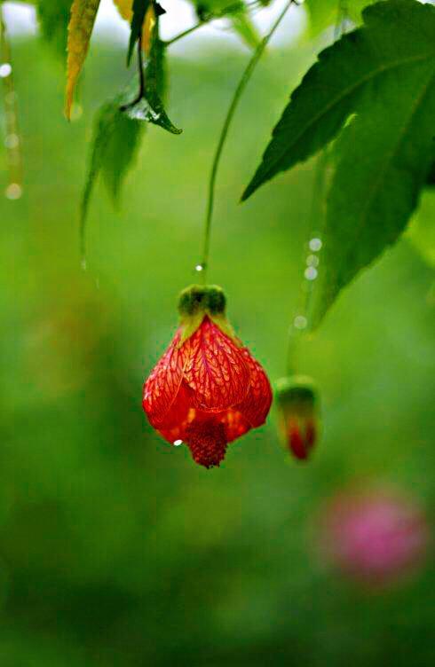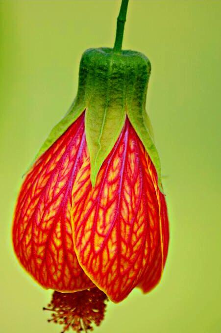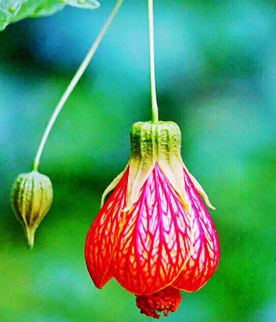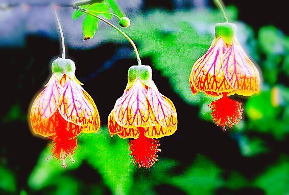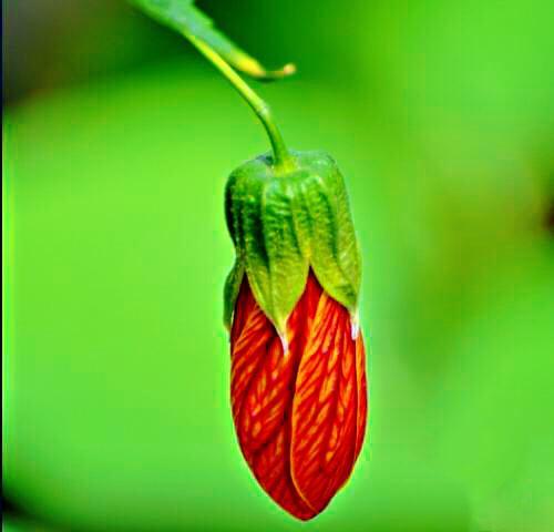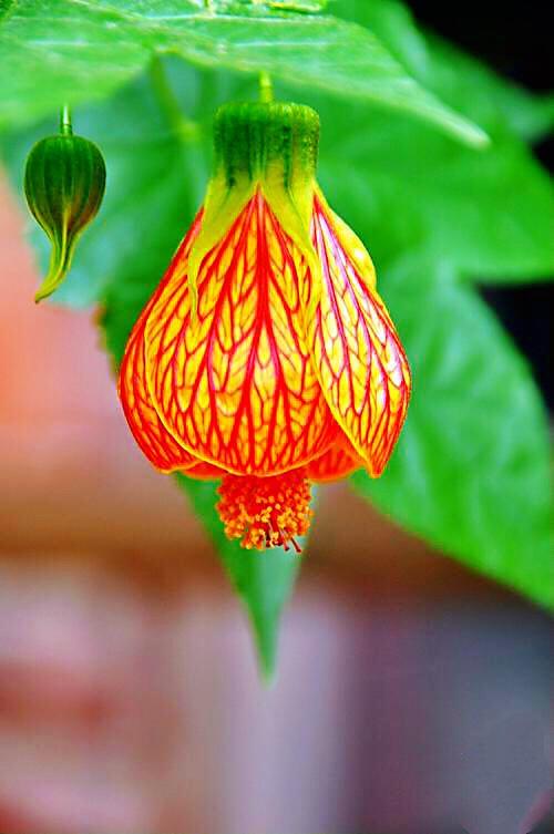 金铃花,锦葵科苘麻属常绿灌木。株高1米。叶翠绿,质厚,边缘锯齿形。花朵钟形,黄色至橙红色,上有紫红色脉纹。花期极长,只要光照充足,温度适宜,可常年开花。