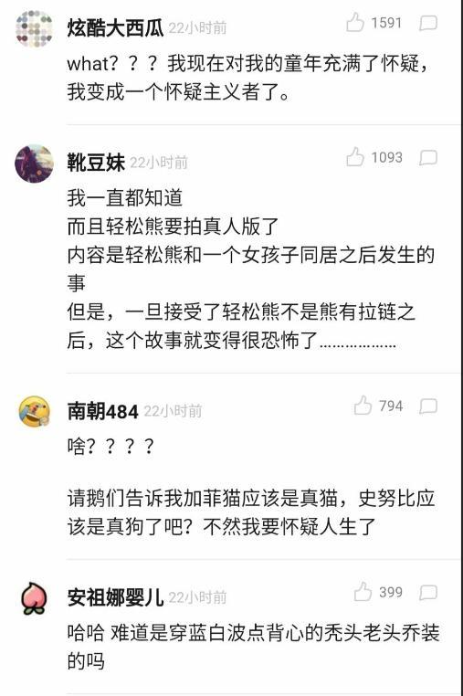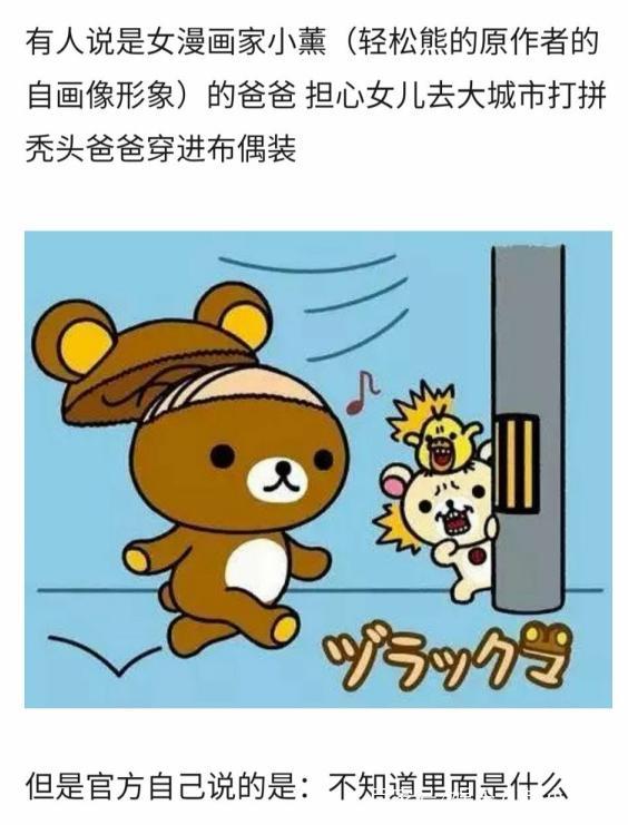 很多网友看到这个消息也和小编一样非常惊讶,轻松熊竟然不是熊而是秃头大叔,很多网友对自己的童年充满了怀疑,还有网友表示:我一直都知道,而且轻松熊要拍真人版了,内容是轻松熊和一个女孩子同居时候发生的事,但是一旦接受了轻松熊不是熊有拉链之后,这个故事就变得很恐怖了,甚至还有网友表示:告诉我加菲猫应该是真猫,史努比应该是真狗了吧?不知道大家对轻松熊不是熊是秃头大叔这件事情是怎么看呢?