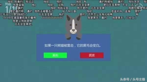 还有一次玩的《正与误》,里面出现了这个问题:如果一只熊猫被雷击,他的黑毛会变白。炸炸分析了一下:这肯定是假的,但是,他为什么会出这么假的题目?弹幕有没有住在四川动物园没有睡觉的熊猫啊,抬一手啊!他看了一会弹幕说:房管,看着什么人说否的,答错了直接给四川动物园打电话!下一题高潮来了..