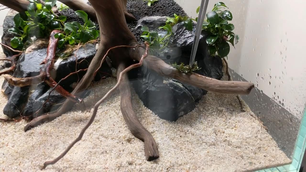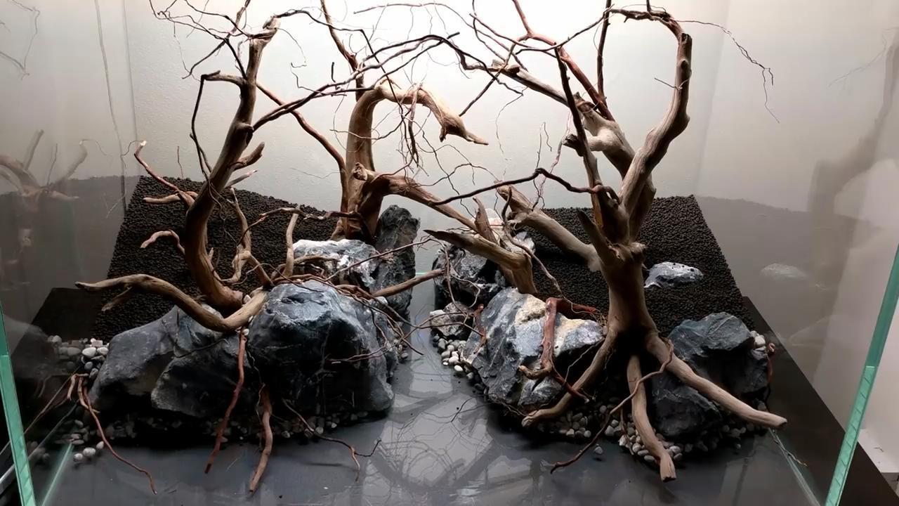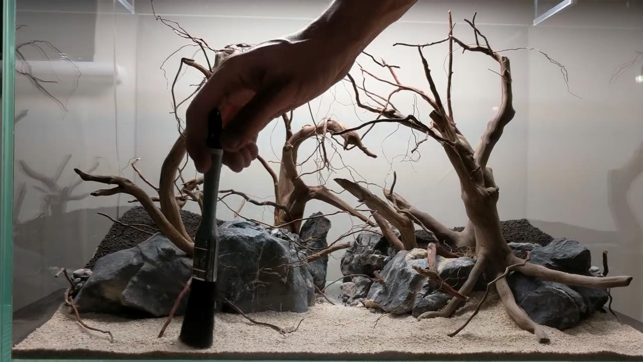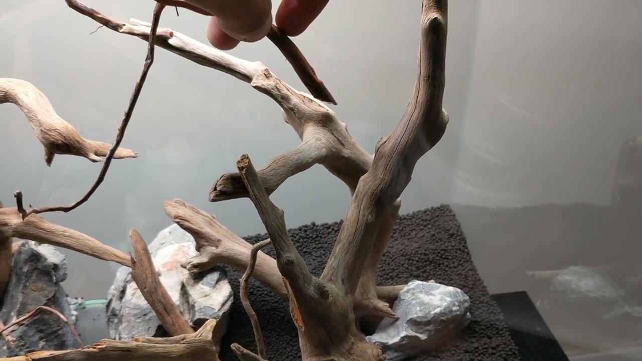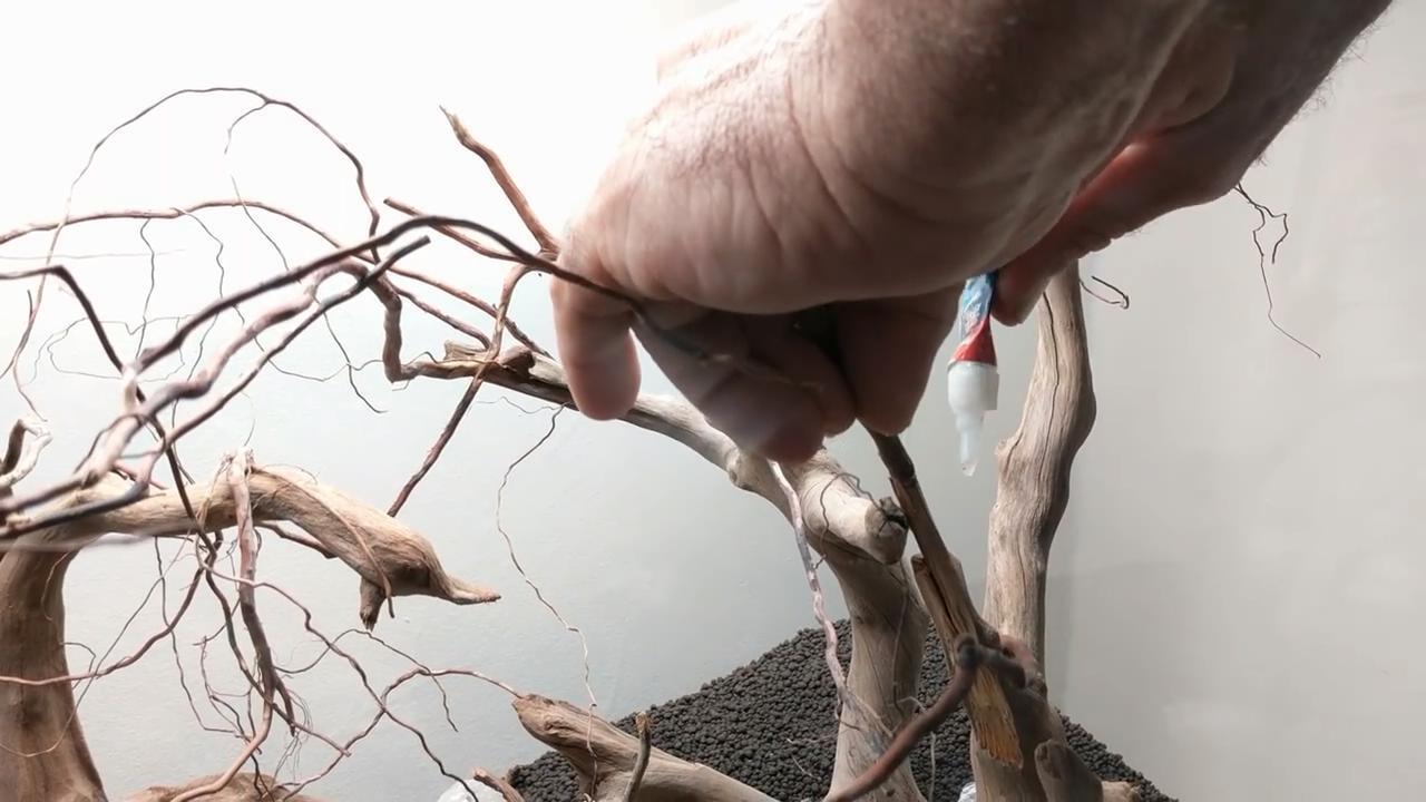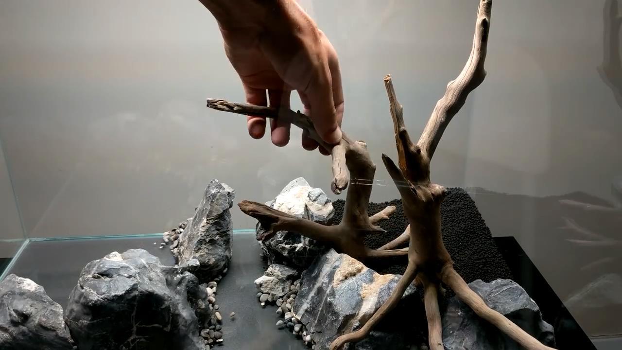 为了让鱼缸景观更有异形,我们需要对杜鹃根进行装饰,可以将一些毛根粘在杜鹃根上,使其形成树杈,方便后期粘莫斯,制作树冠。