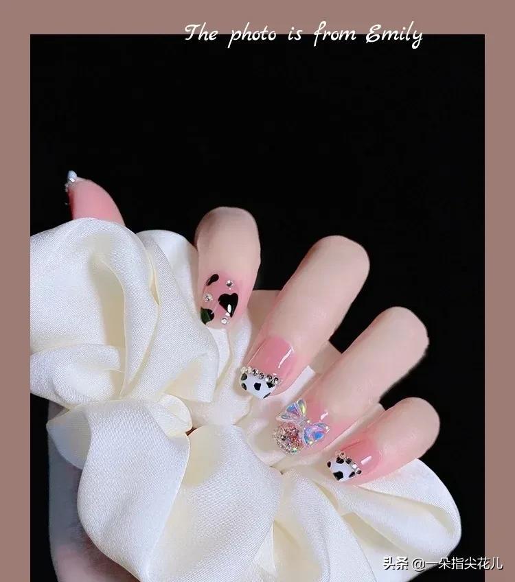 第四款:裸粉透色打底搭配彩绘爱心,和半法式奶牛纹,粉嫩又可爱。