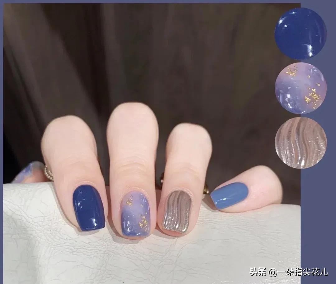 第八款:紫色蓝色的跳色,搭配银色魔镜粉水波纹和对角晕染配金箔碎。