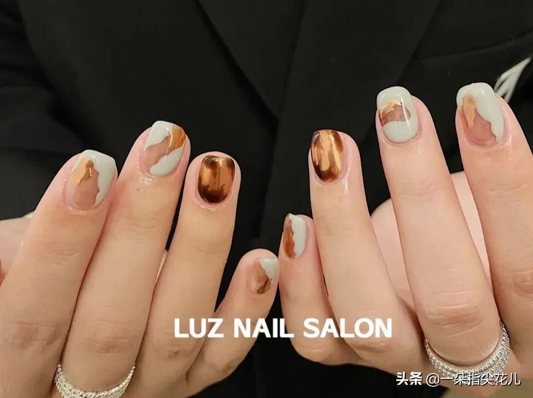 第七款:这是一款短款的欧美时尚美甲。白色色块搭配魔镜粉跳琥珀晕染。超有范!