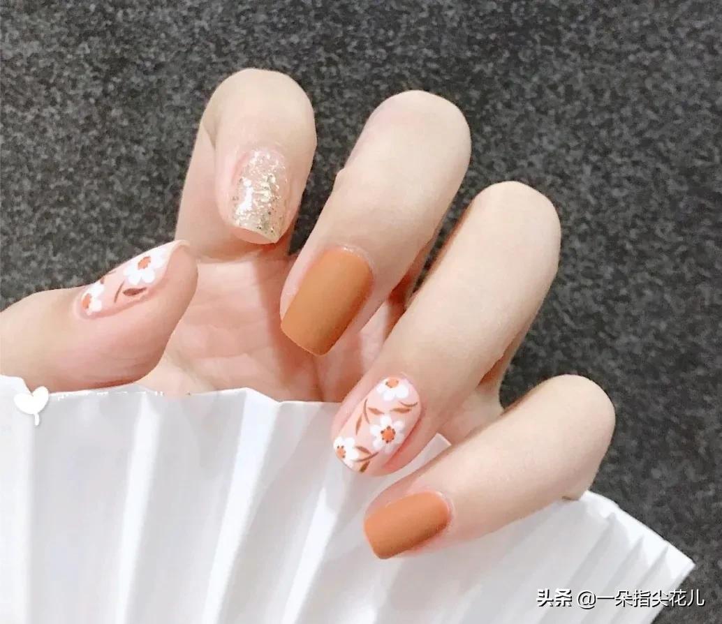 第一款:驼色和粉色香槟金亮星跳色,搭配白色花卉,整体看起来非常的温柔。