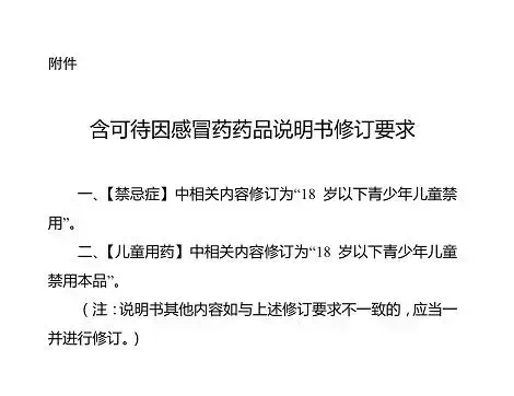9月6日,国家药品监督管理局发布公告,对含可待因感冒药说明书进行修订。“禁忌症”中相关内容修订为“18岁以下青少年儿童禁用”。