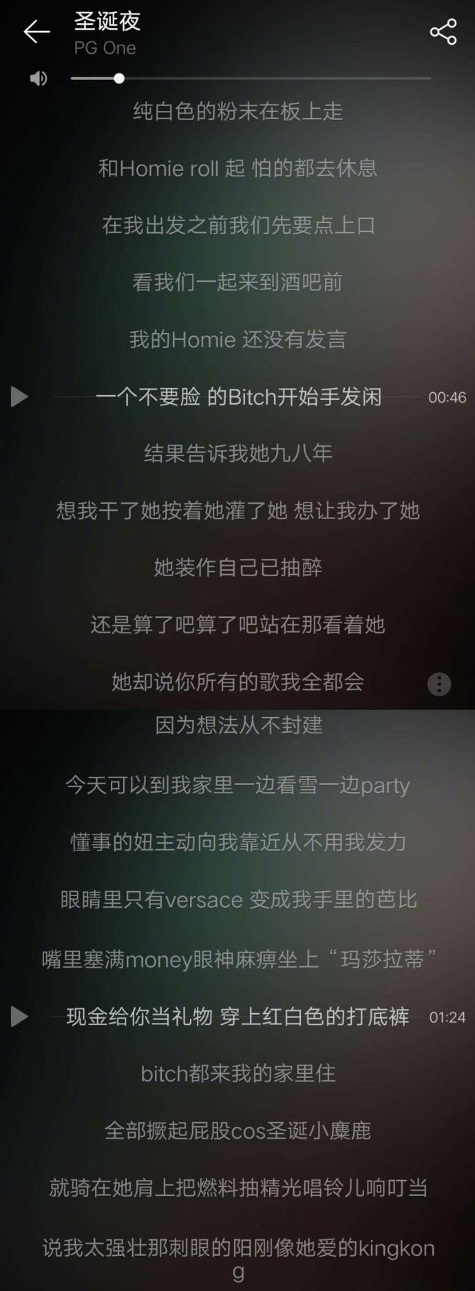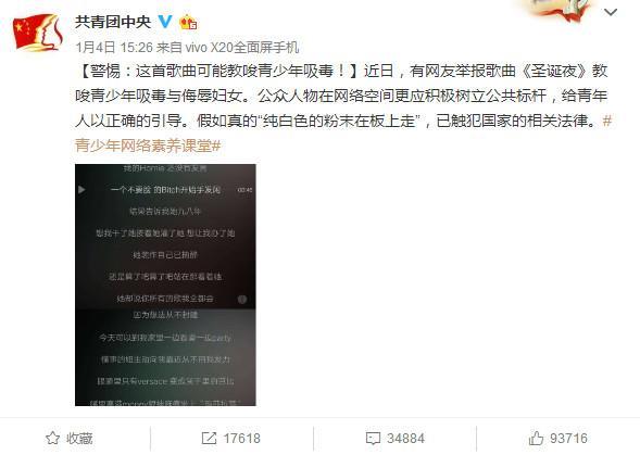 近日,共青团中央微博发出公告,内容如图所示,有网友举报:PGONE的歌曲《圣诞夜》歌词中含有多段不雅得语句词汇。歌词内容如下: