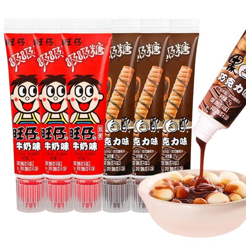 8、综合糖果类:旺仔吸吸糖以及旺仔棒棒糖。其中的旺仔吸吸糖包含了黑白配千克力口味和旺仔牛奶口味。