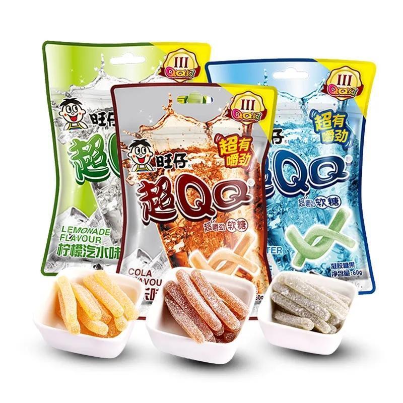 3、软糖类:旺仔QQ糖、旺旺QQ浆爆、旺仔QQ肉垫糖、旺仔超QQ、旺仔果汁软糖、旺仔QQ缤纷豆软糖、旺仔双层QQ糖、旺仔QQ欢乐礼包系列以及旺仔巧克蕾特。如旺仔QQ糖包含9种经典口味,Q弹有嚼劲。