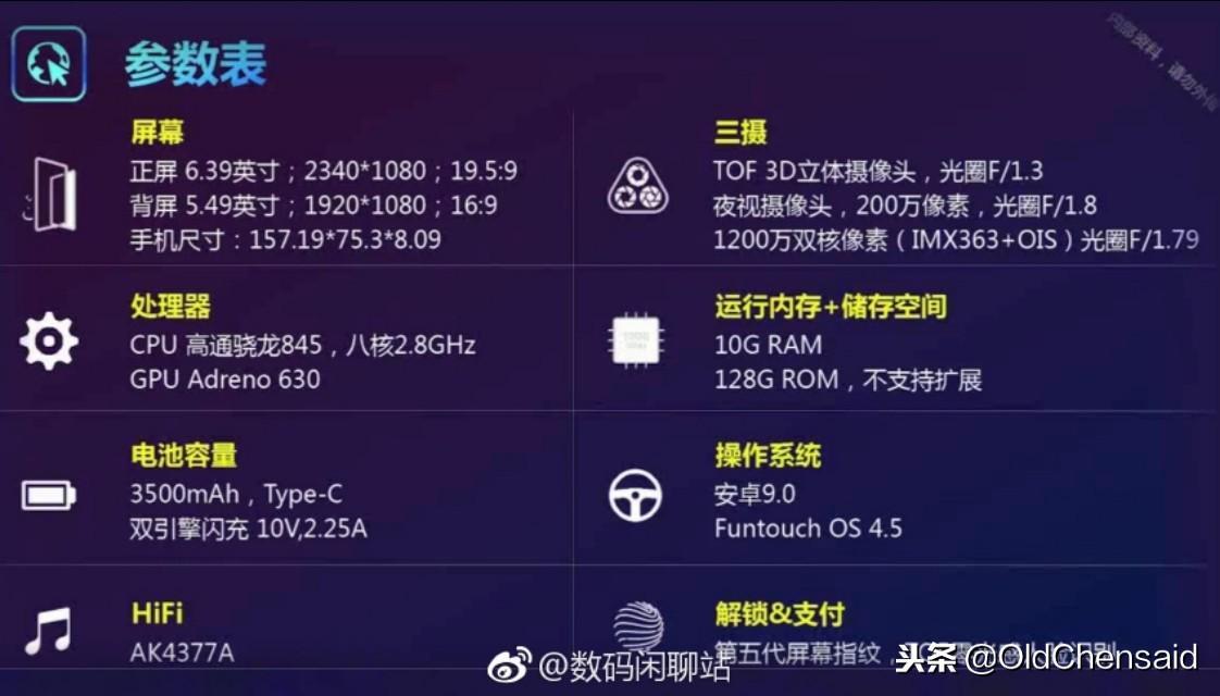 vivo NEX双屏版主屏采用的是一块6.39的屏幕,副屏采用的是一块5.49寸的屏幕,后置三摄分别是一颗TOF镜头,一颗200万像素的夜视镜头以及一颗1200万像素的索尼IMX363主镜头。处理器采用的是骁龙845,最高存储容量为10+128G,电池容量为3500mAh,支持22.5W快充,采用第五代屏幕指纹,支持面部支付