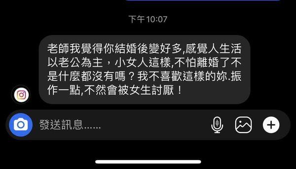 KIMIKO 13日在社群平台分享收到的网友私讯,对方批她「结婚后变好多」,感觉整个人的生活都以老公为主,还直言若是一直当小女人「不怕离婚后什么都没有吗」,激动表示要KIMIKO振作一点、不然会被女生讨厌。