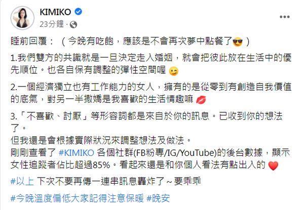 对此,KIMIKO说,自己和老公从决定走入婚姻后,共识就是要将彼此放在生活中的优先顺位,但也各自保有弹性空间,「一个经济独立也有工作能力的女人,拥有的是从零到有创造自我价值的底气,对另一半撒娇是我喜欢的生活情趣嘛。」KIMIKO还特地调出后台数据,回击说:「刚刚查看了KIMIKO各个社群的后台数据,显示女性追踪者占比超过85%,看起来还是和你个人看法有点出入的。」
