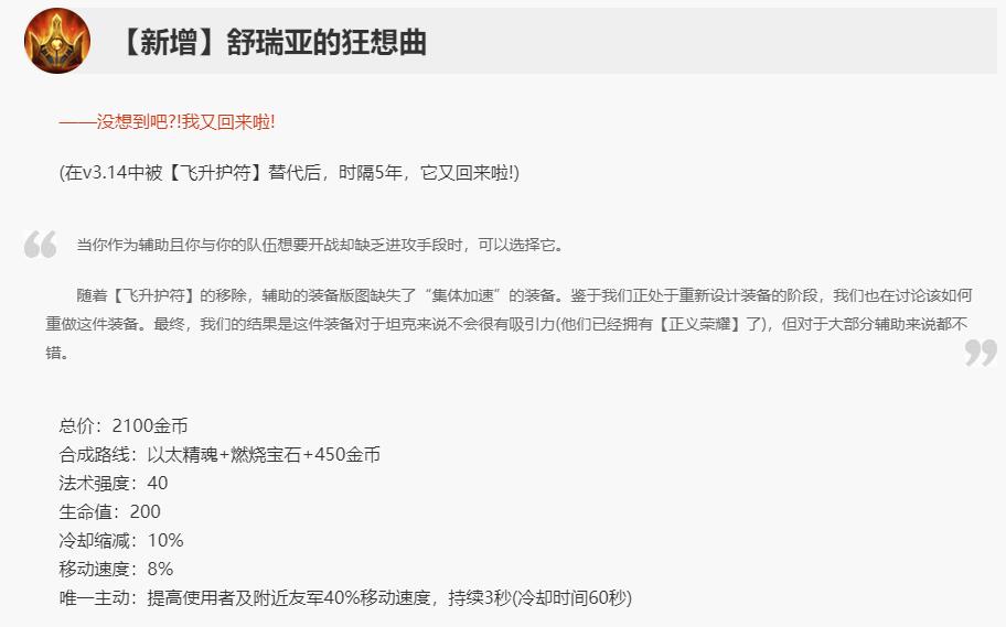 时隔5年之后,皇冠再度回归到召唤师峡谷,和以前一样的群体主动加速但是却加上了法术强度的属性,相比之前的辅助型装备,新版皇冠也为更多的英雄提供了他们极其需要的移动速度以及少量的法强。