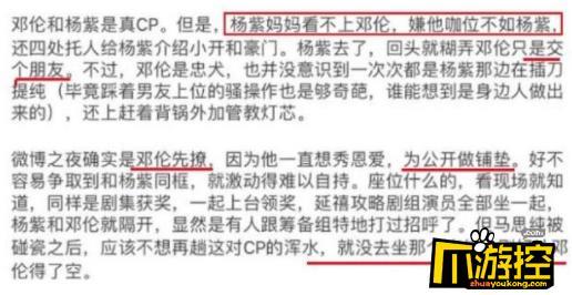 对于小编的疑问,爆料者也在后文解释了,是因为杨紫的妈妈看不上邓伦,嫌弃邓伦的咖位不如杨紫,杨紫目前是娱乐圈的一线明星,但是邓伦还算不上是一线明星。还表示在微博之夜那天,邓伦秀恩爱就是为了接下来的公开做铺垫,还因为获得了跟杨紫同框的机会,激动不已,但是杨紫却一点不想公开恋情,全程异常的冷漠。