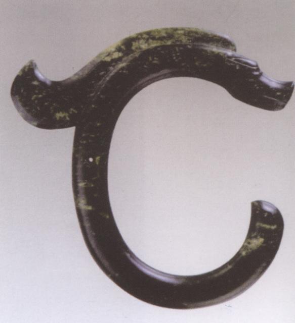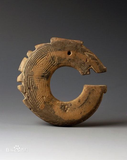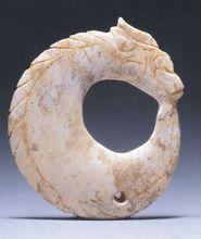 安徽凌家滩白玉龙。距今五千年左右。首尾相联的扁环形,鸡骨白色泛绿斑,此龙除背环一周明确的脊鬣,尤为形象的是龙首呈牛头形,头上两支微翘的弯角,直观就是当地水牛头上的双角。