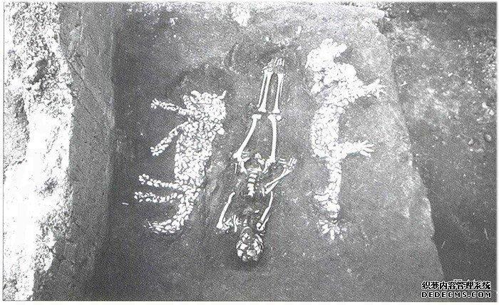 1987年,在河南濮阳西水坡近7000年前的仰韶文化时期古墓葬群的考古发现中,令人惊喜的发现了M45蚌壳摆塑龙虎图——既是迄今发现最早的蚌塑的龙形,又是最早的“四象”构图——青龙白虎,朱雀和玄武。