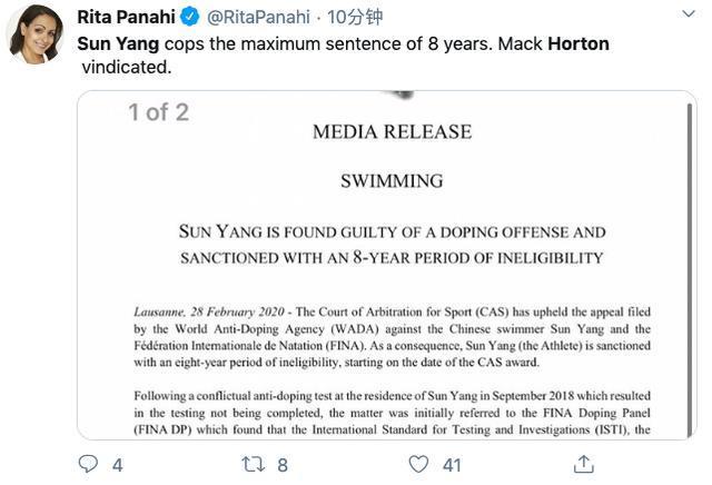 2020年2月26日,美联社报道:国际体育仲裁法庭对孙杨的判决将在几天内宣布,同时,美联社称:“国际泳联一直致力于让孙杨免遭处罚。”