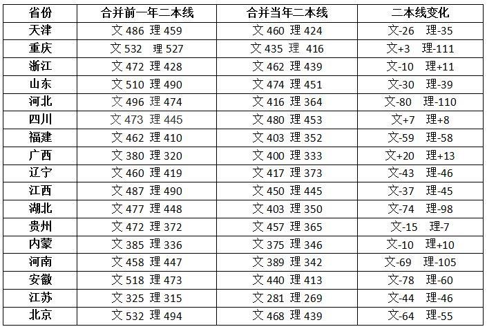 由于二本、三本合并,增加了二本录取院校的数量,二本分数线将出现巨大波动。我们查找了国内十余个已进行二三本合并的省市近年来高考分数线,发现绝大部分省市在二三本合并当年,都下调了二本的录取分数线。