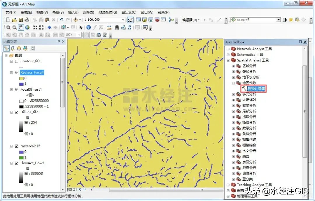 在ArcToolbox内点击“Spatial Analyst工具\地图代数\栅格计算器”,调用栅格计算器工具。