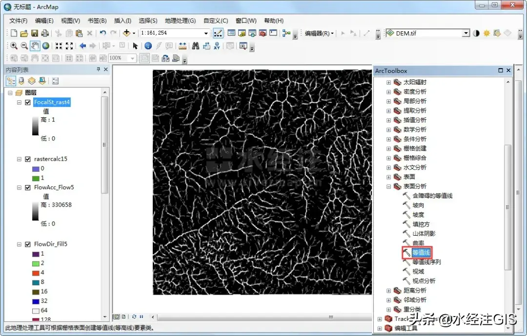 在ArcToolbox内点击“Spatial Analyst工具\表面分析\等值线”,调用等值线工具。
