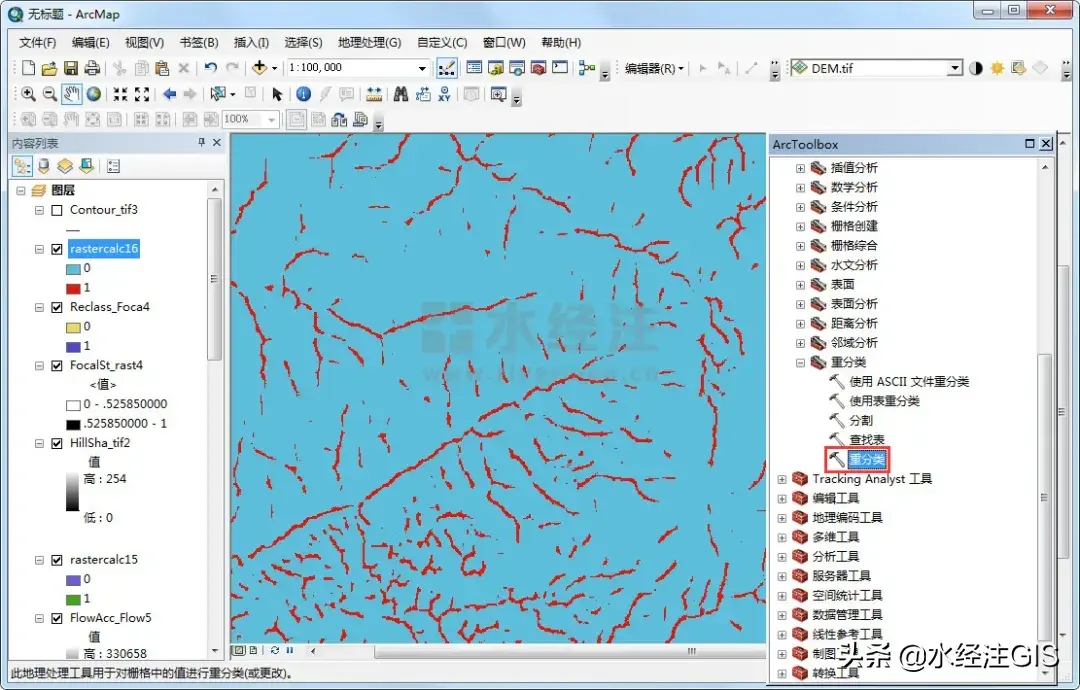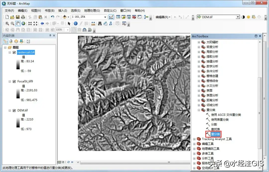 在ArcToolbox内点击“Spatial Analyst工具\重分类\重分类”,调用重分类工具。
