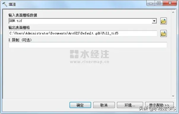 在显示的填洼对话框内,输入表面栅格数据为下载的DEM数据,如下图所示。