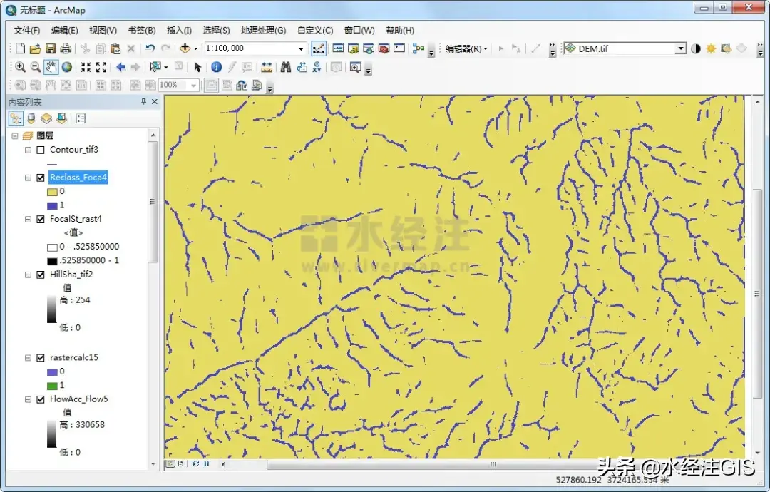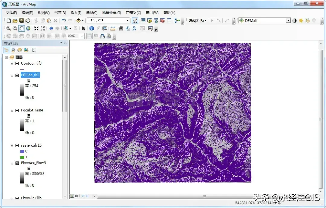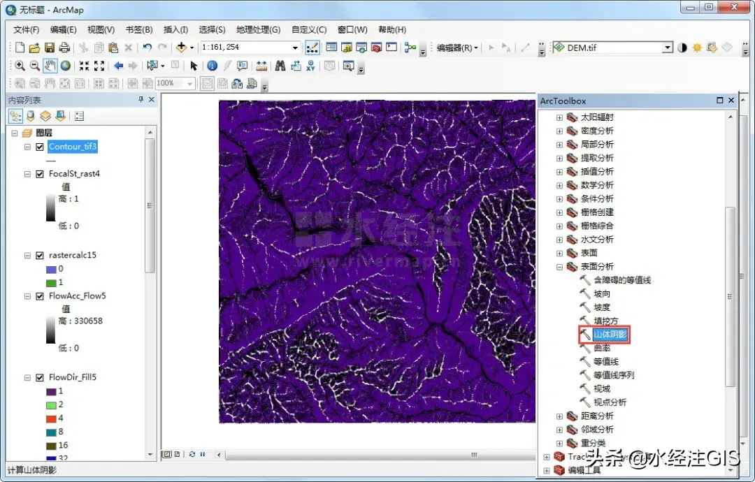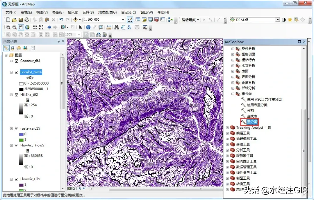 为了判断重分类的阈值,需要先生成等高线和山体阴影帮助判断。