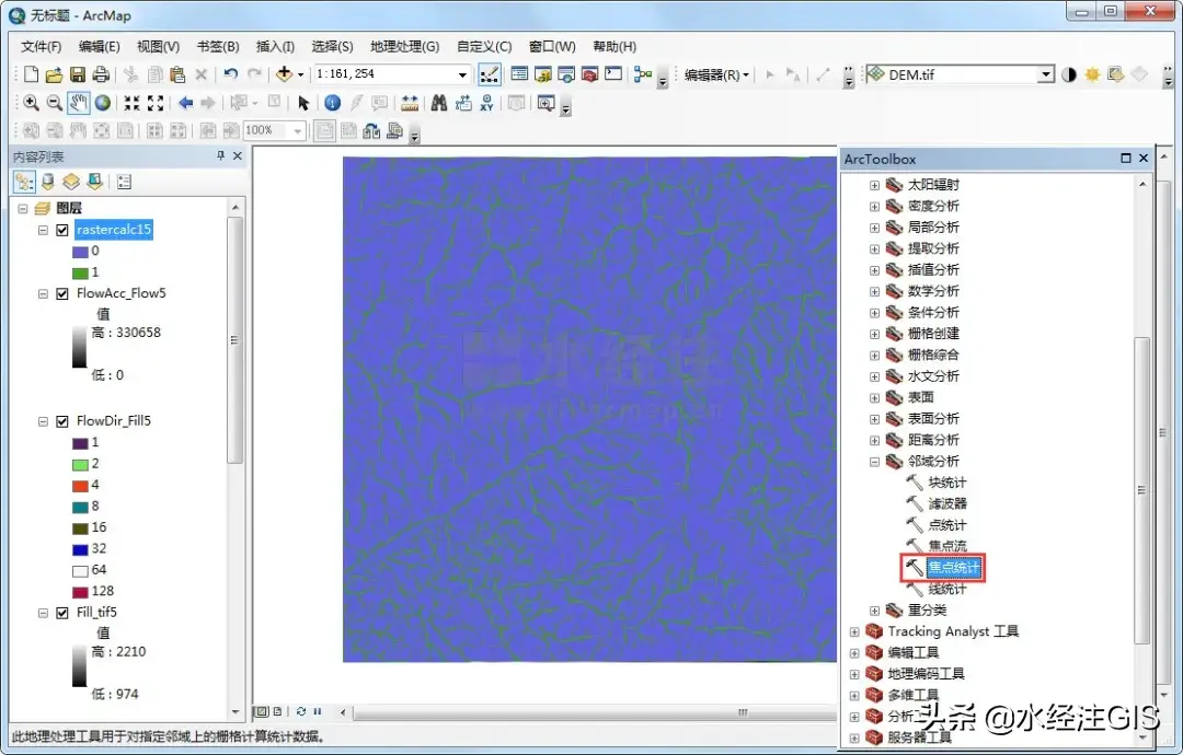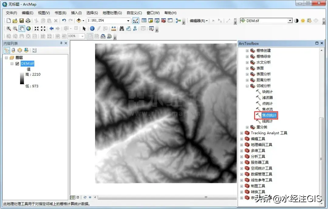 通过邻域分析平滑山脊线,在ArcToolbox内点击“Spatial Analyst工具\邻域分析\焦点统计”,调用焦点统计工具。