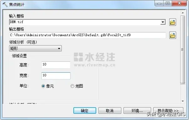 在显示的焦点统计对话框内,输入下载的DEM数据,设置邻域高度和宽度为10,如下图所示。