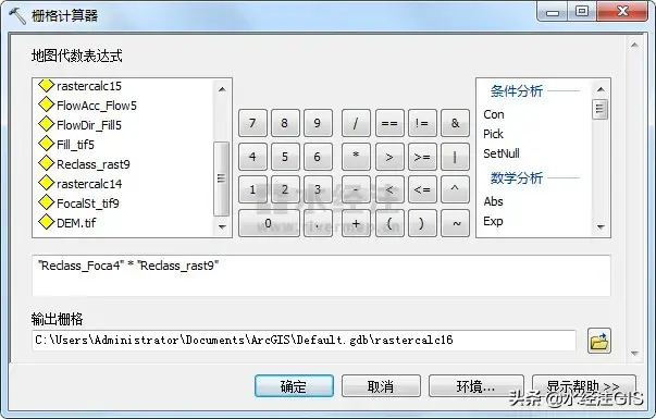 在显示的栅格计算器对话框内,输入下面的公式:"Reclass_Foca4" * "Reclass_rast9",其中"Reclass_Foca4" 为上一步重分类结果,"Reclass_rast9"为最开始得到的正地形。