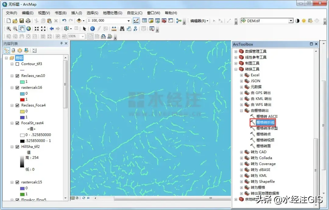 如果需要将山脊线提取成矢量,可以在ArcToolbox内点击“转换工具\由栅格转出\栅格转折线”将山脊线栅格转换为矢量。