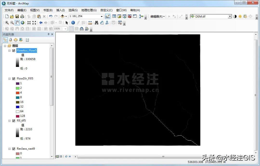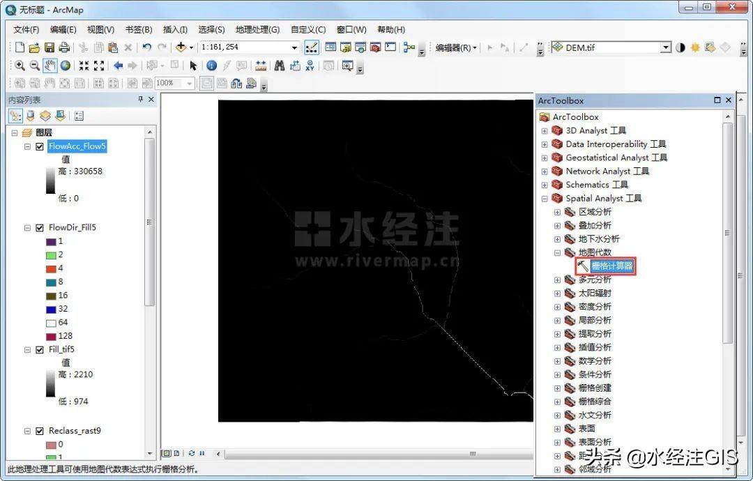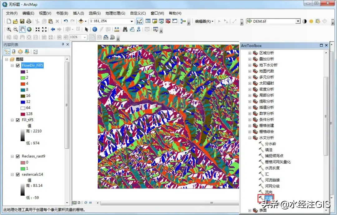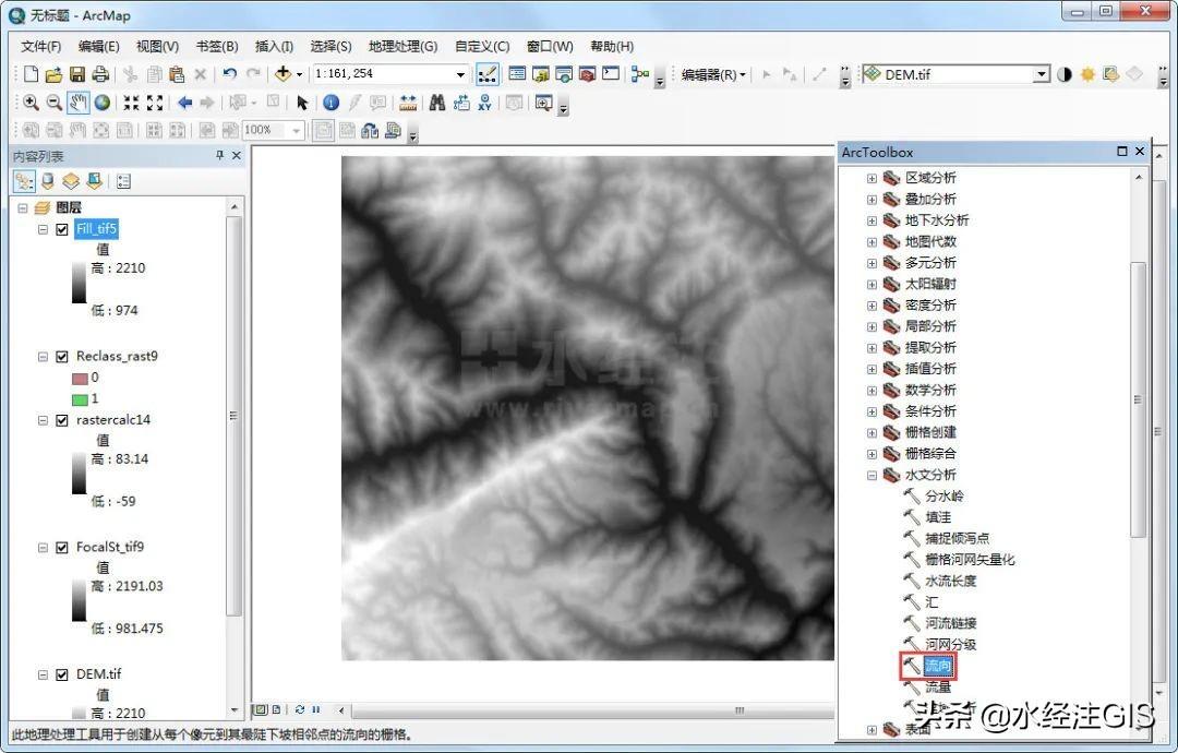 在ArcToolbox内点击“Spatial Analyst工具\水文分析\流量”,调用流量工具。