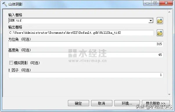 在显示的山体阴影对话框内,输入栅格为下载的DEM数据,如下图所示。