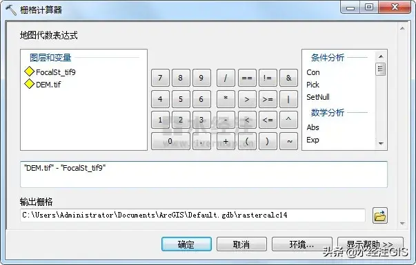 在显示的栅格计算器对话框内,输入下面公式:"DEM.tif" - "FocalSt_tif9",如下图所示。