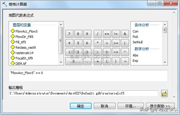 在显示的栅格计算器对话框内,输入下面的公式:"FlowAcc_Flow5" == 0,获取流量为0的区域。