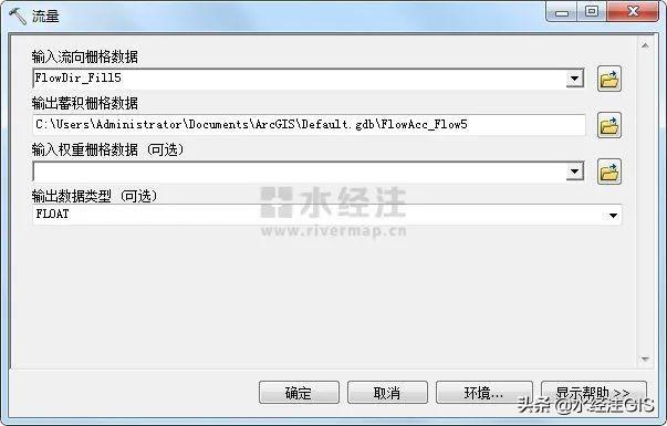 在显示的流量对话框内,输入流向栅格数据为上一步得到的流向结果,如下图所示。