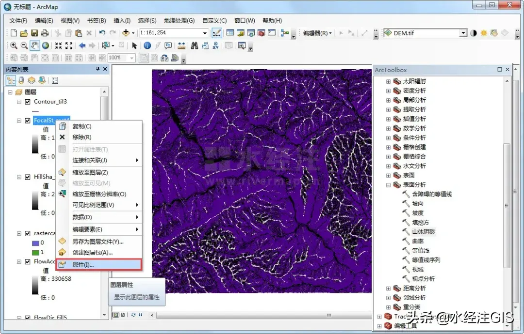 在焦点统计的栅格图上点击右键,选择属性,如下图所示。