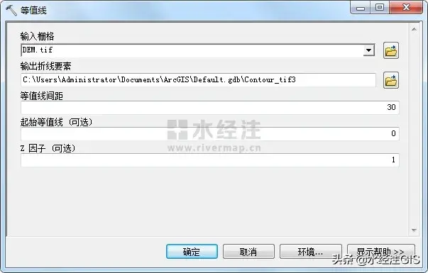 在显示的等值线对话框内,输入栅格选择下载的DEM数据,等值线间距设置为30,如下图所示。