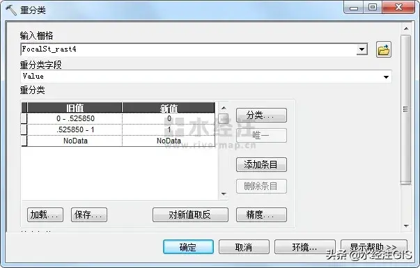 在显示的重分类对话框内,将阈值(0.52585)以下赋值为0,阈值(0.52585)以上赋值为1,如下图所示。