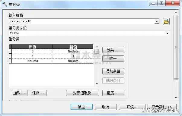 在显示的重分类对话框内,输入栅格为上一步的计算结果,将0赋值为NoData,1赋值为1,如下图所示。