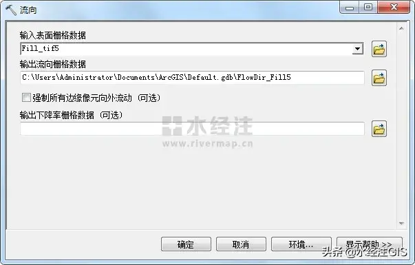 在显示的流向对话框内,输入表面栅格为上一步填洼后的栅格,如下图所示。