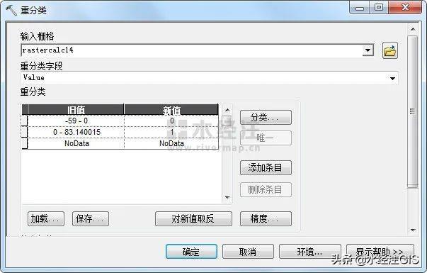 在显示的重分类对话框内,以值0为界,小于0赋值为0,大于0赋值为1,如下图所示。